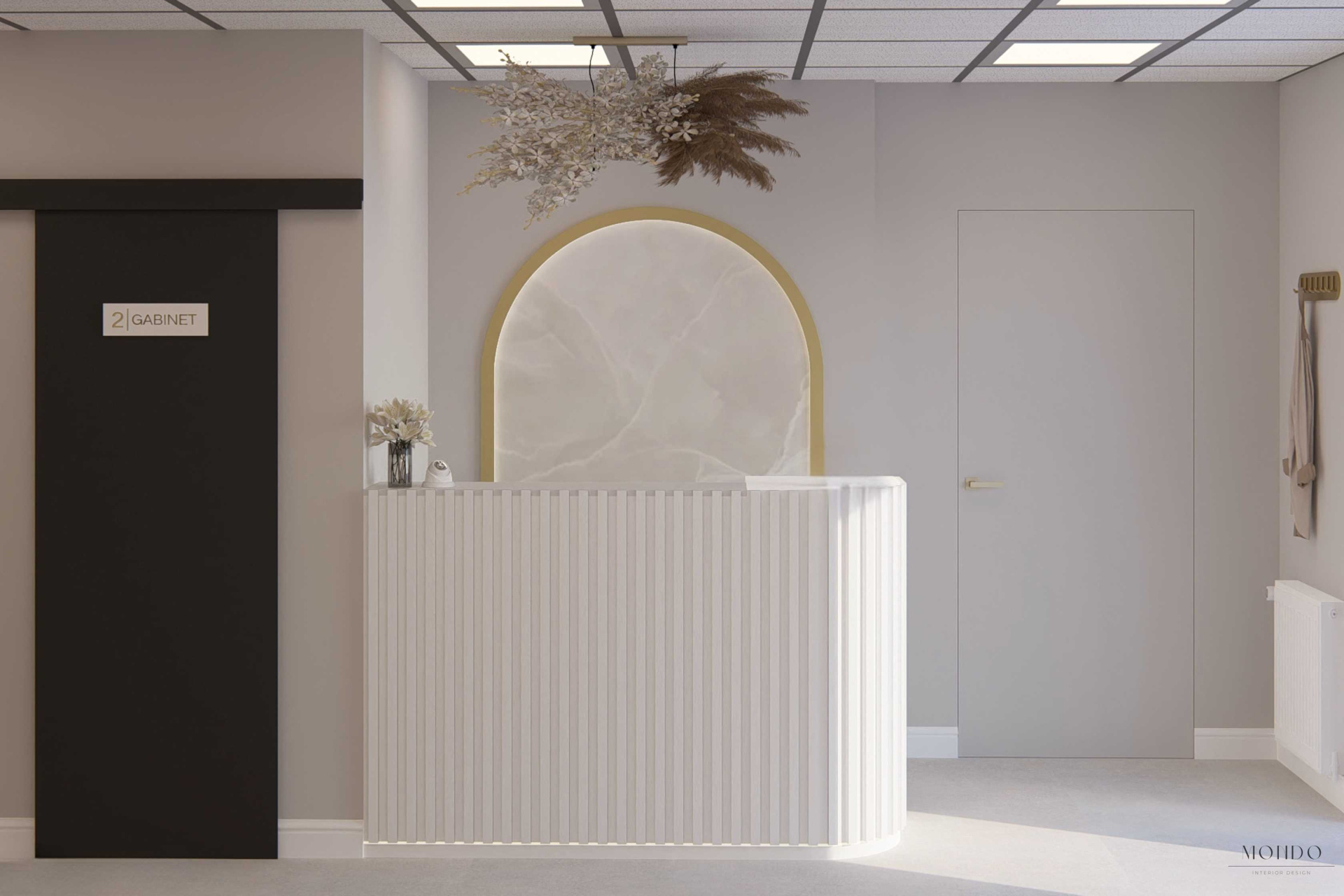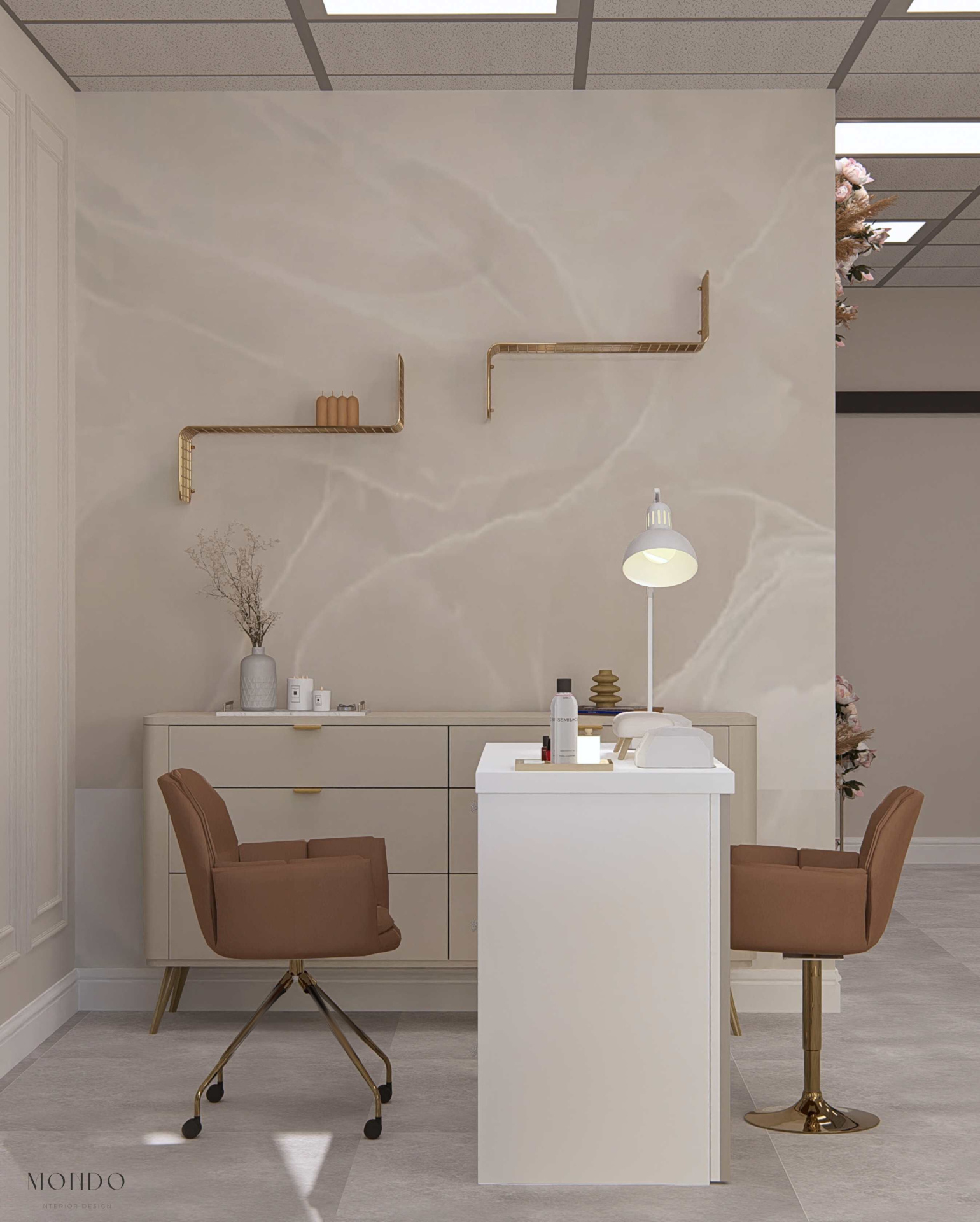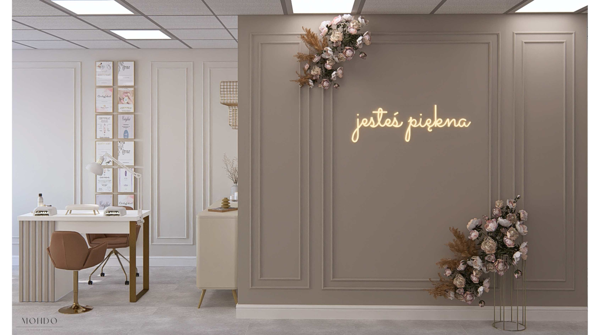 W projekcie salonu kosmetycznego przestrzeń utrzymana jest w jasnej i stonowanej kolorystyce oraz stylu nawiązującego do nowoczesnego glamour, który aż zaprasza do skorzystania z usług piękna 💆🏼‍♀️💅🏼