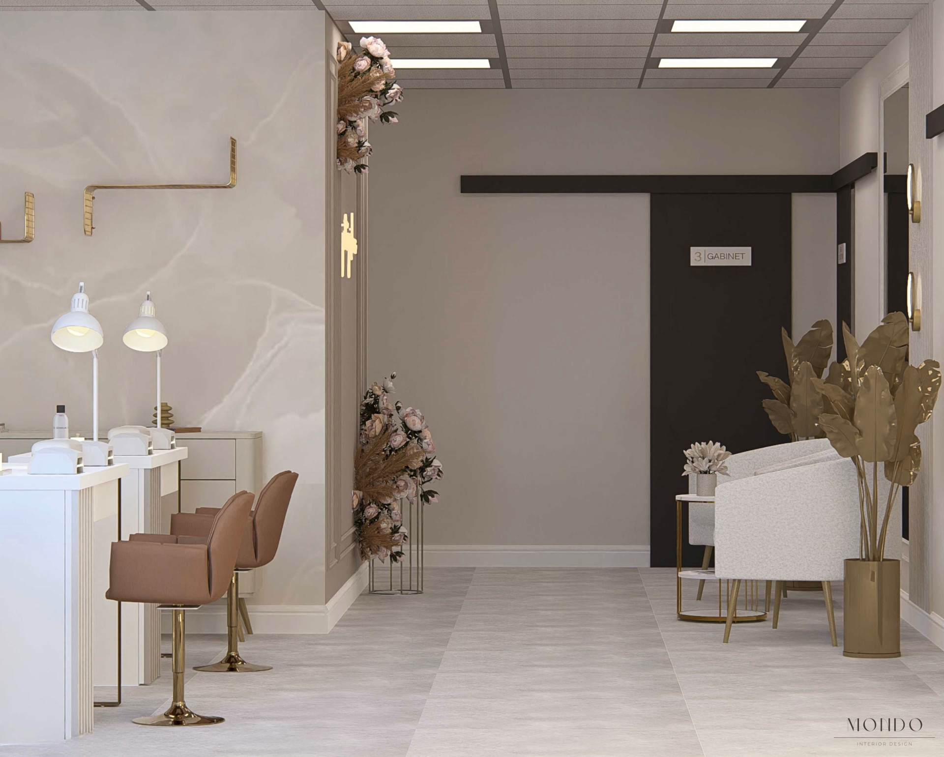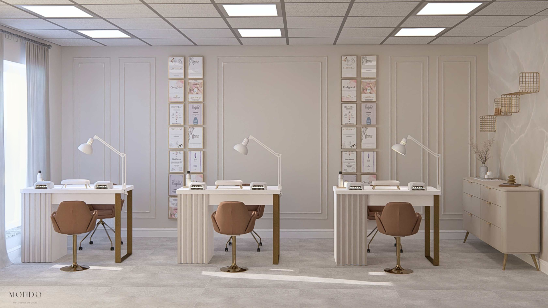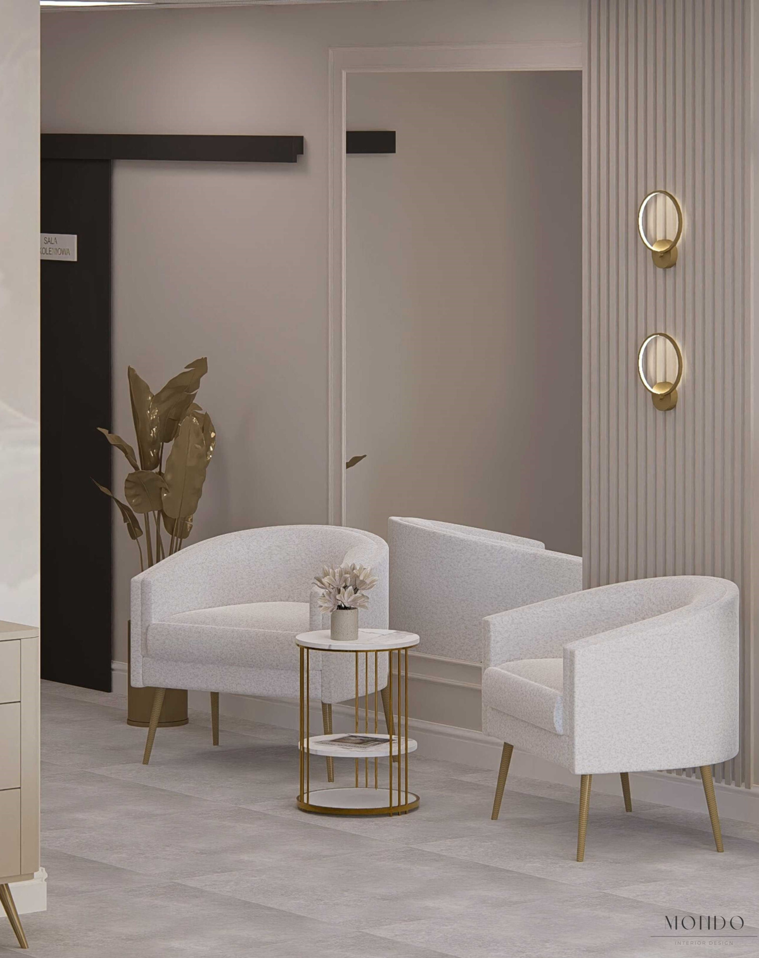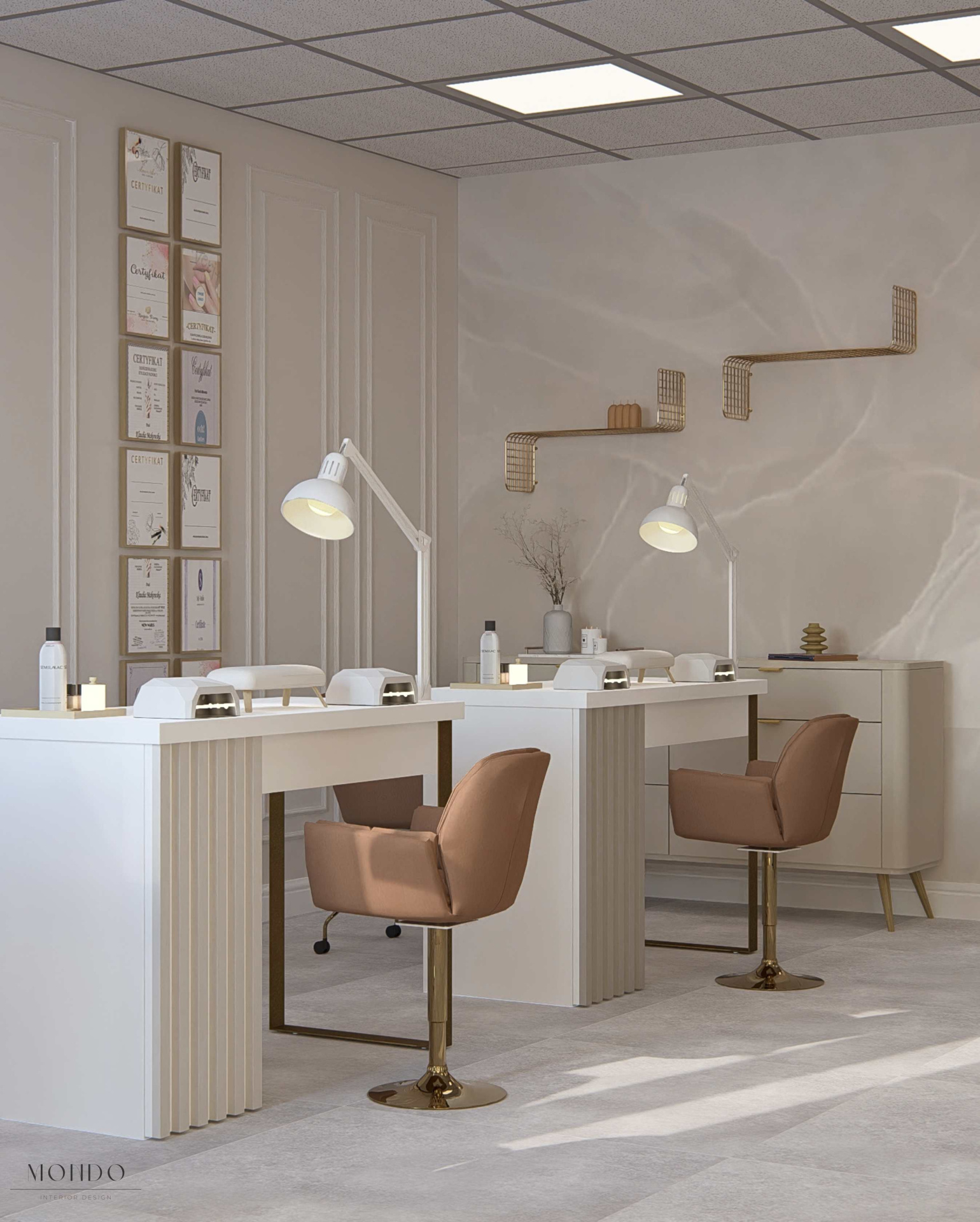W projekcie salonu kosmetycznego przestrzeń utrzymana jest w jasnej i stonowanej kolorystyce oraz stylu nawiązującego do nowoczesnego glamour, który aż zaprasza do skorzystania z usług piękna 💆🏼‍♀️💅🏼