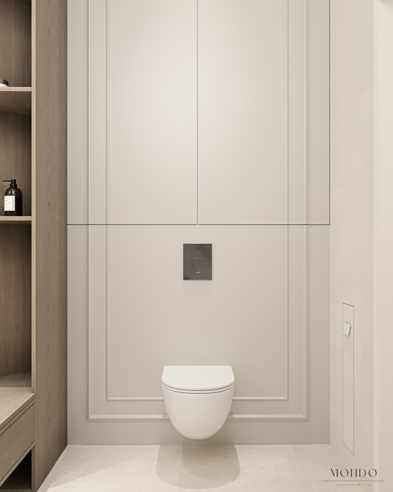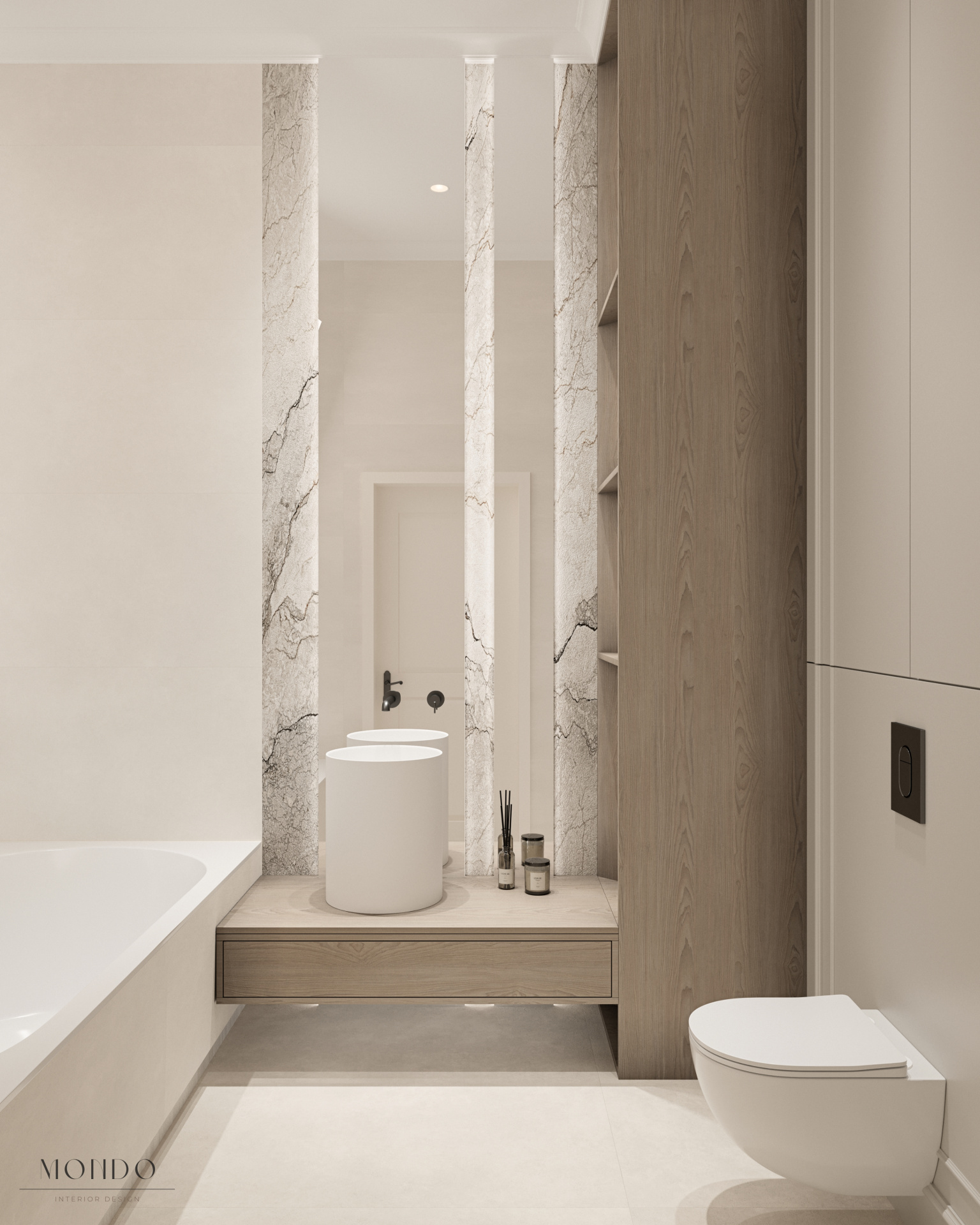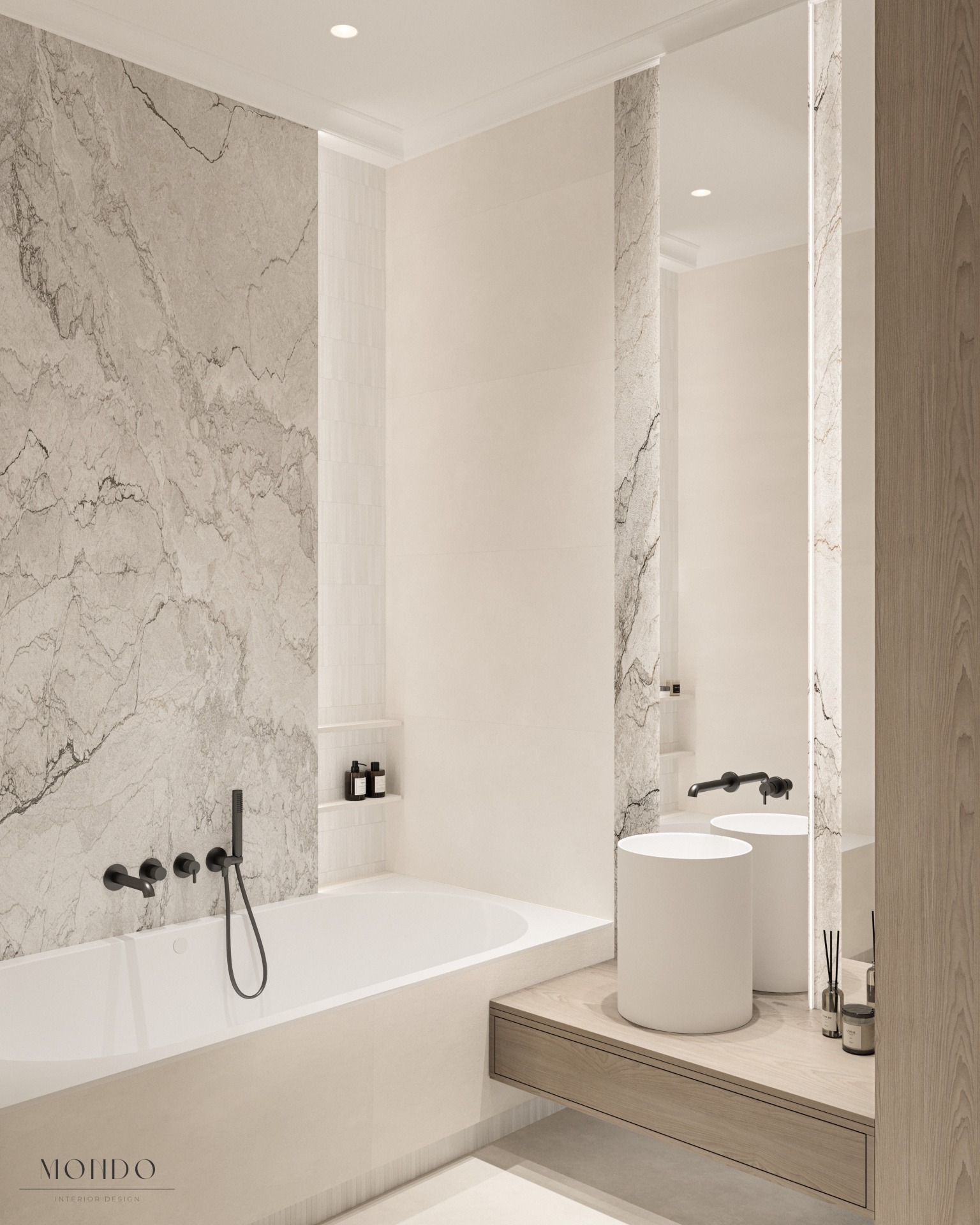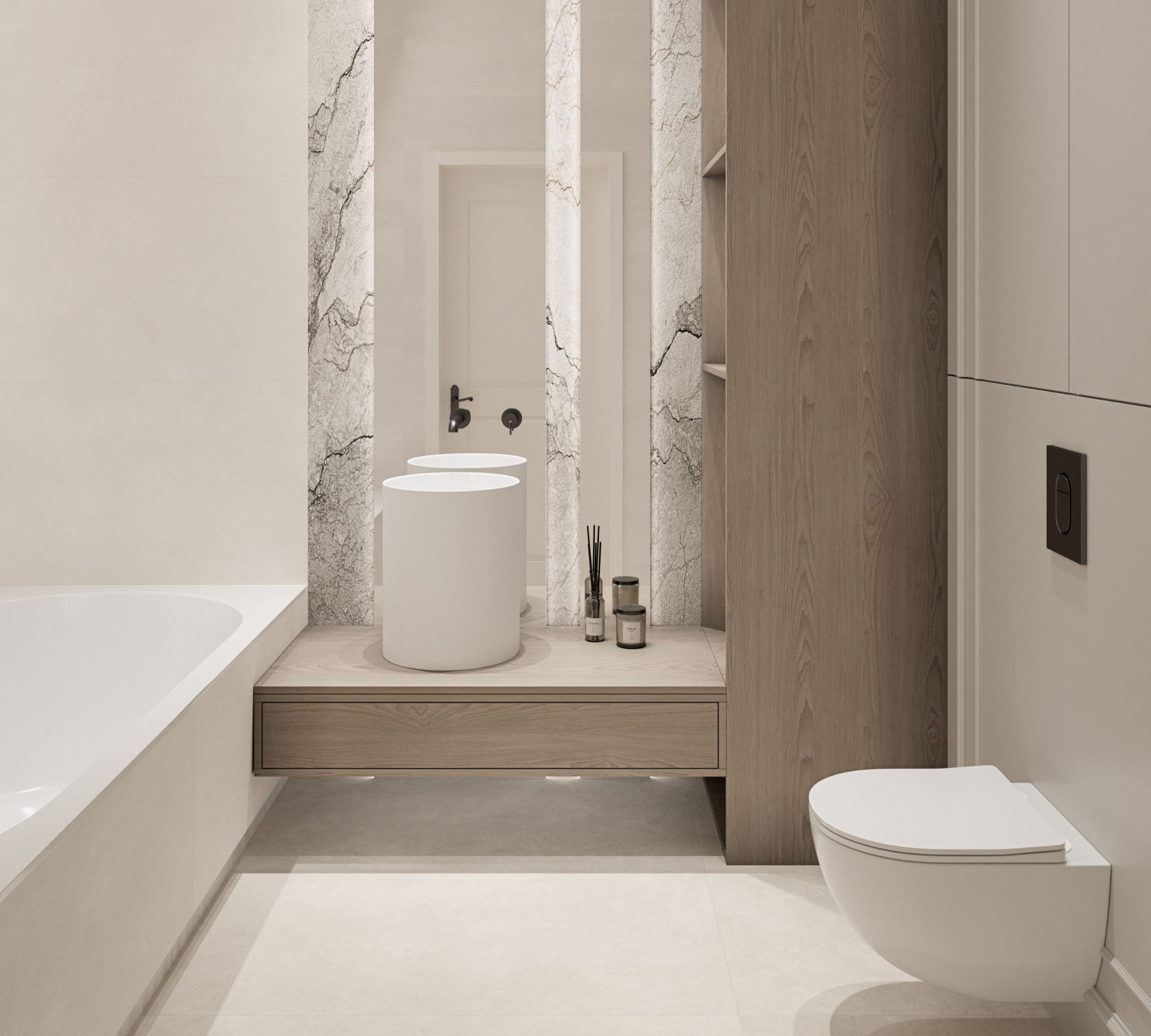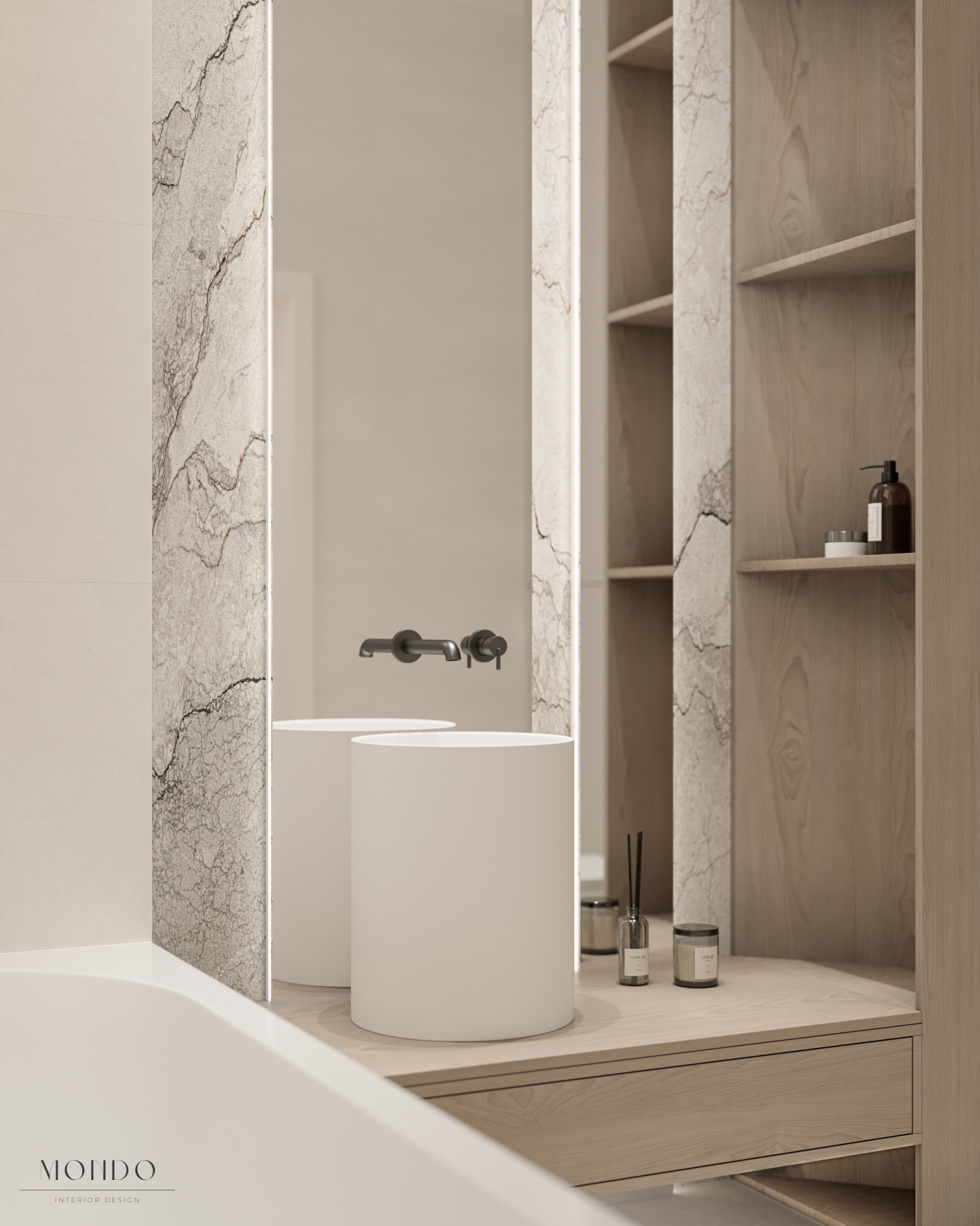 Prywatna łazienka wydzielona w strefie sypialnianej, zaprojektowana z myślą o komforcie i przytulności użytkownika. Centralnym elementem wnętrza jest wanna, która służy relaksowi i regeneracji. Całość utrzymano w jasnej, naturalnej tonacji z przewagą drewna, podkreślając ciepły i spokojny charakter przestrzeni. Nowoczesny minimalizm został przełamany akcentującą płytką umieszczoną za wanną i umywalką, dodając wnętrzu subtelnej elegancji.