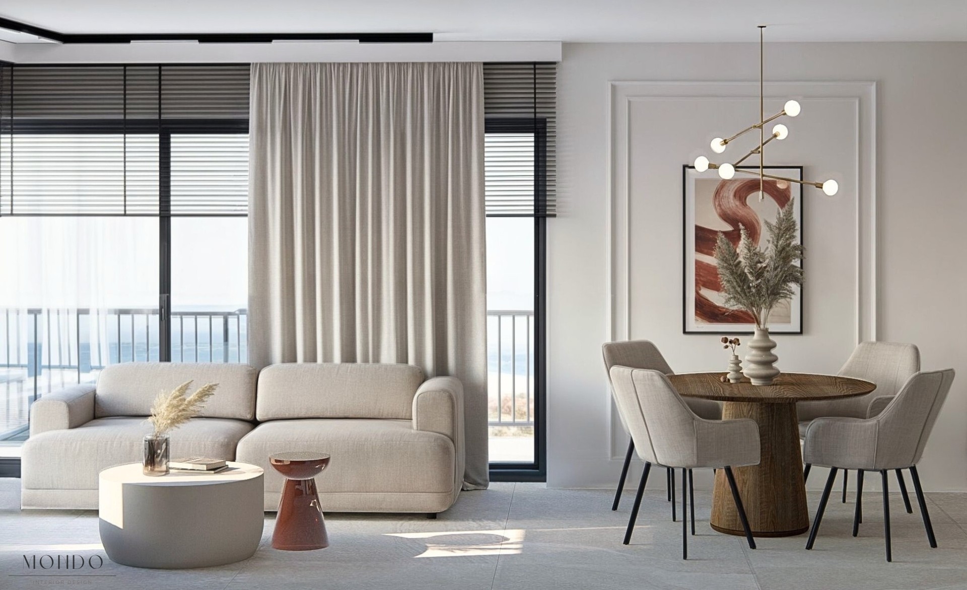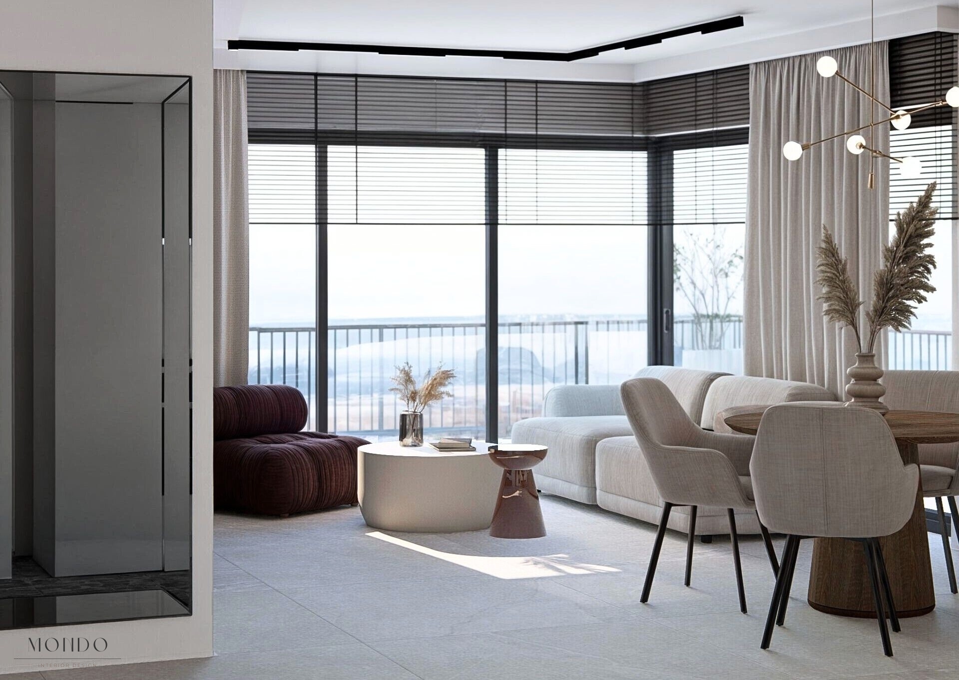 Każdy detal został przemyślany, tworząc spójną i elegancką przestrzeń, w której można odpocząć i cieszyć się widokiem na morze. 🌊
