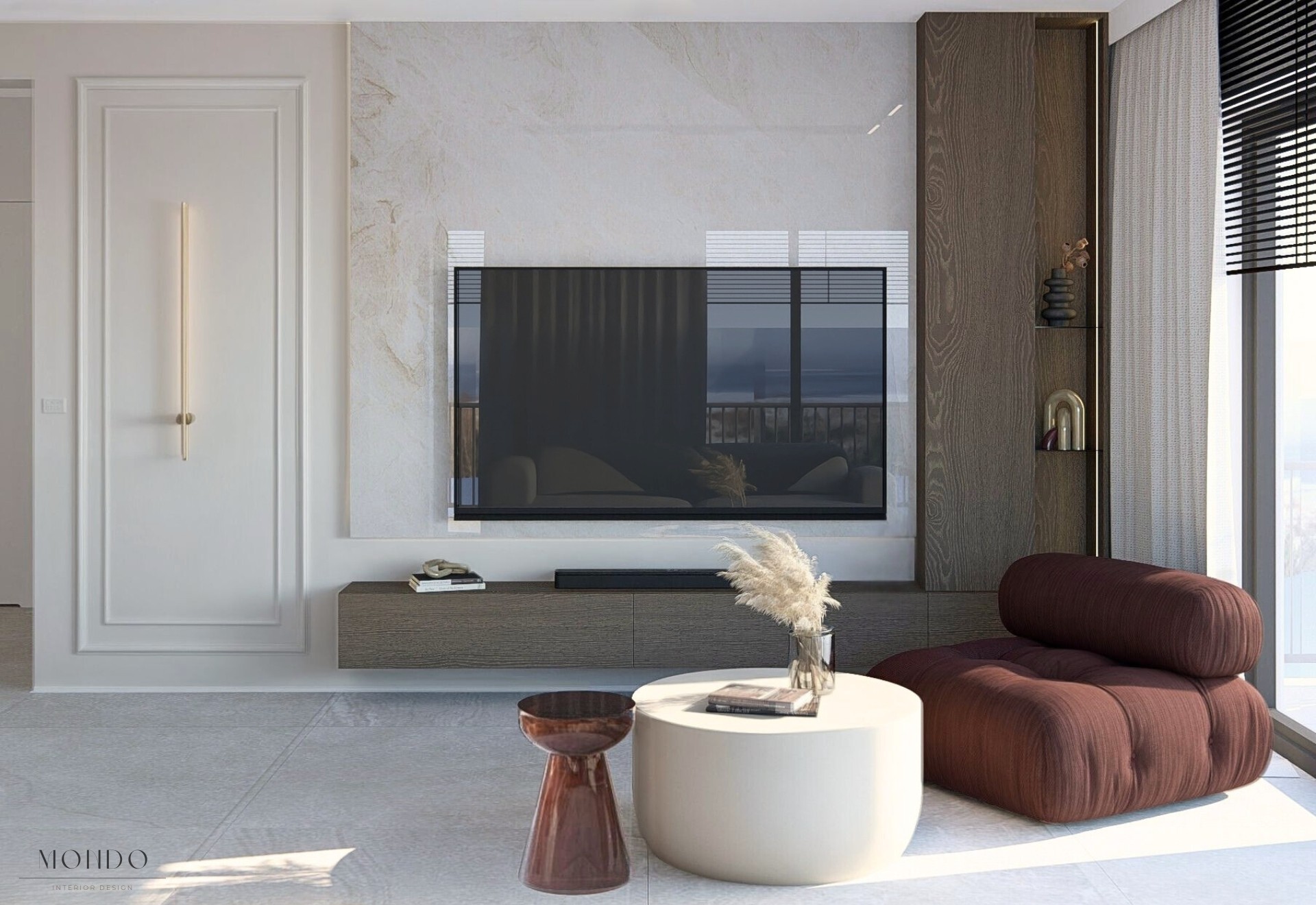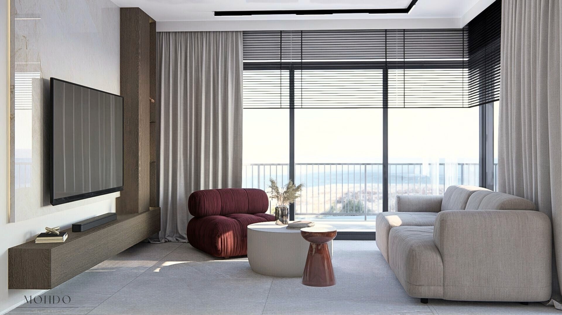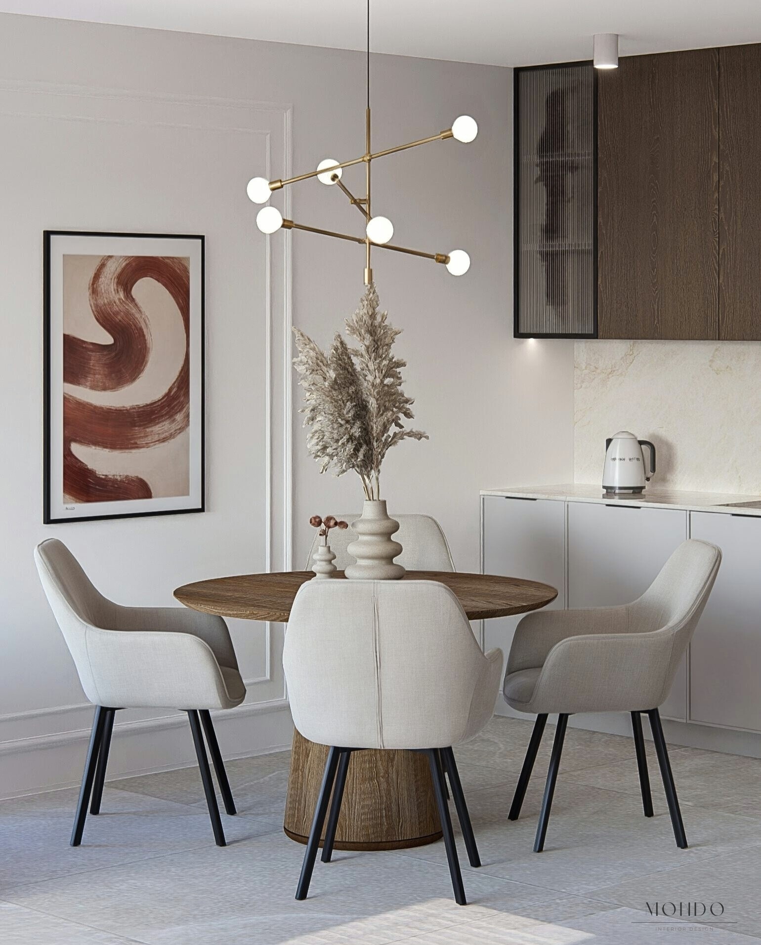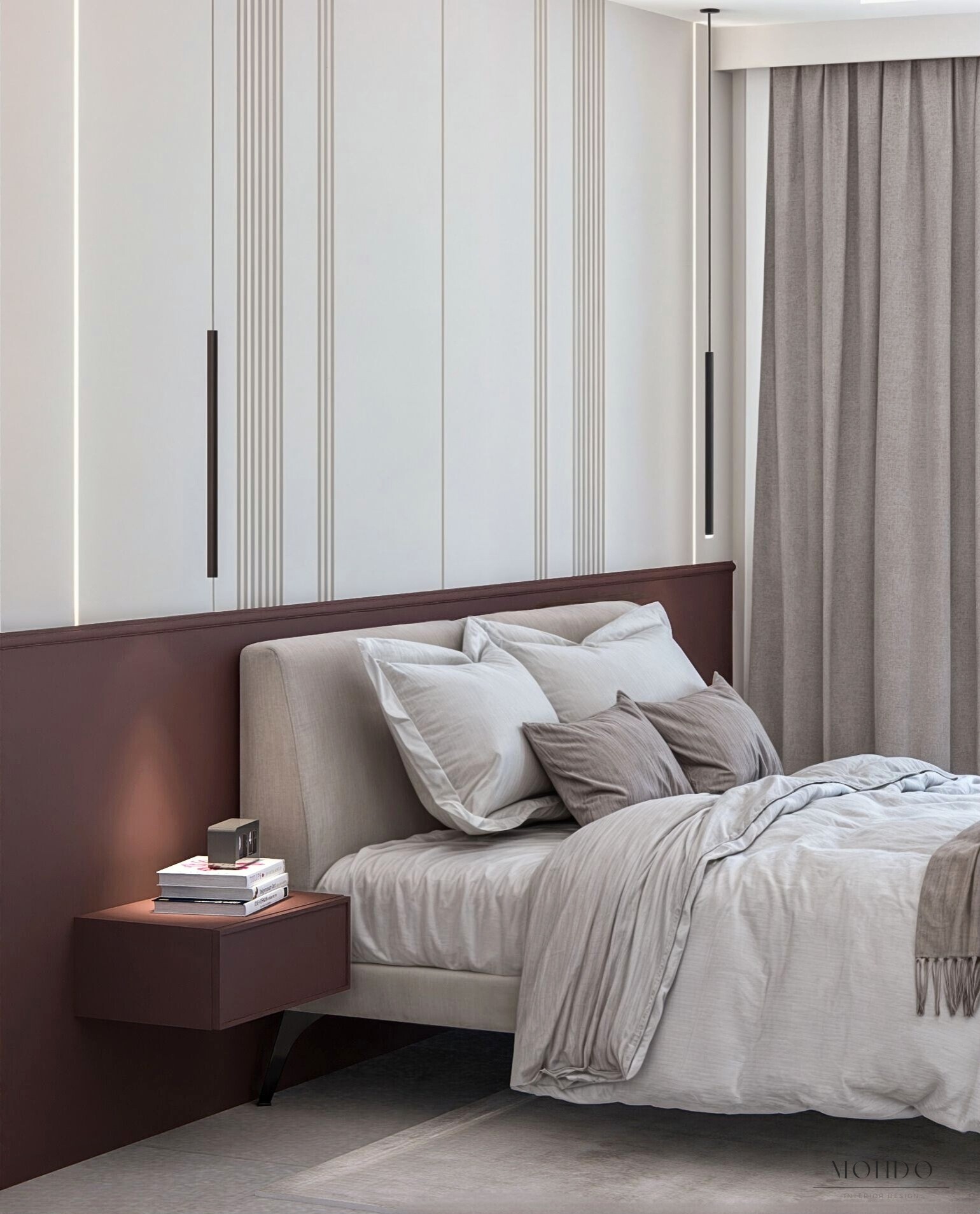 Wnętrze apartamentu w Międzywodziu to połączenie subtelnych beżów z akcentami głębokiego bordo oraz ciepłym, ciemnym drewnem.