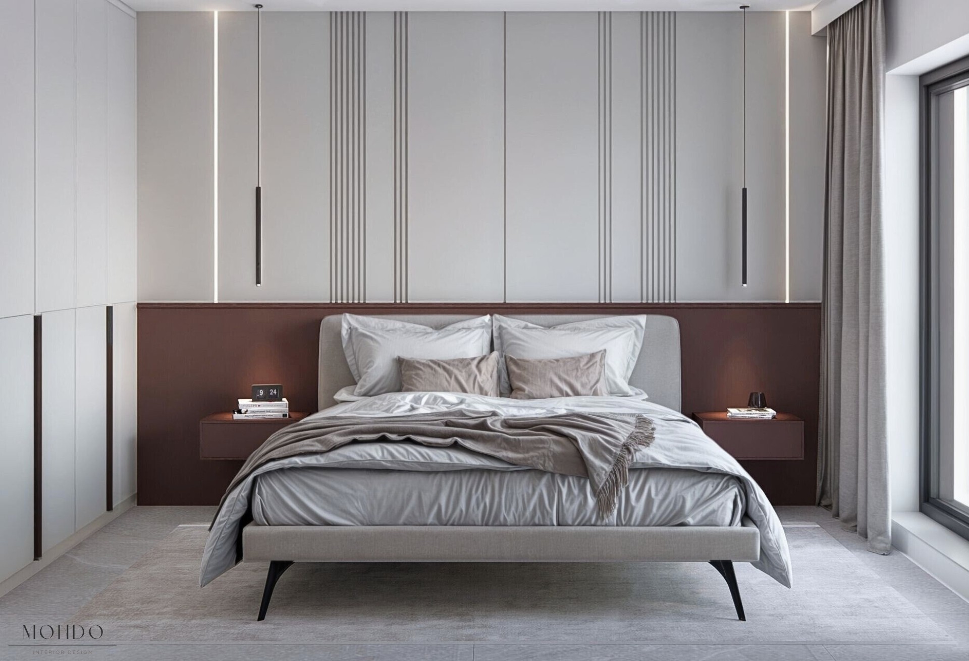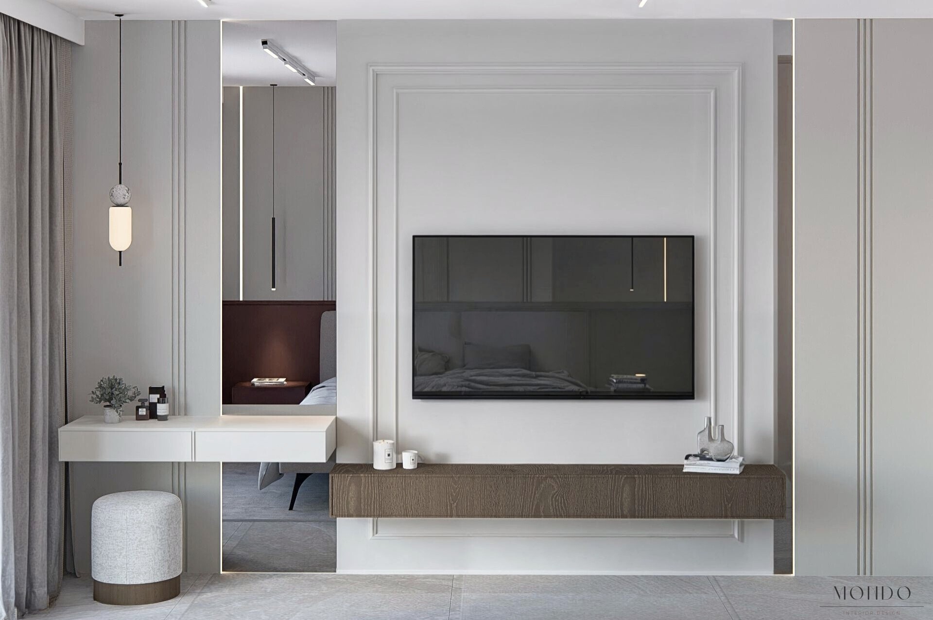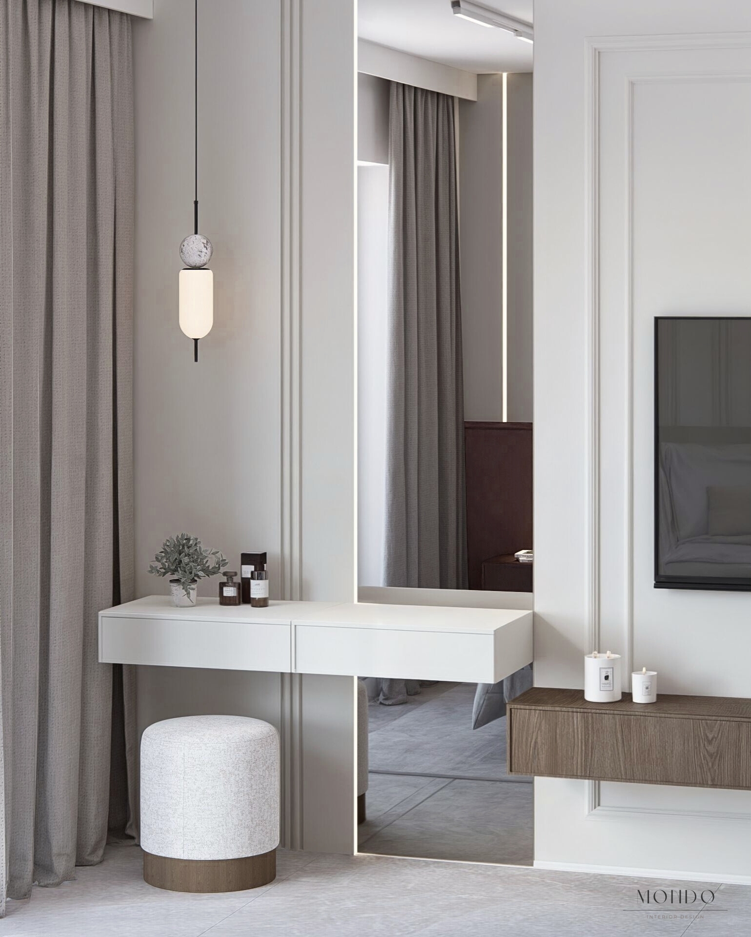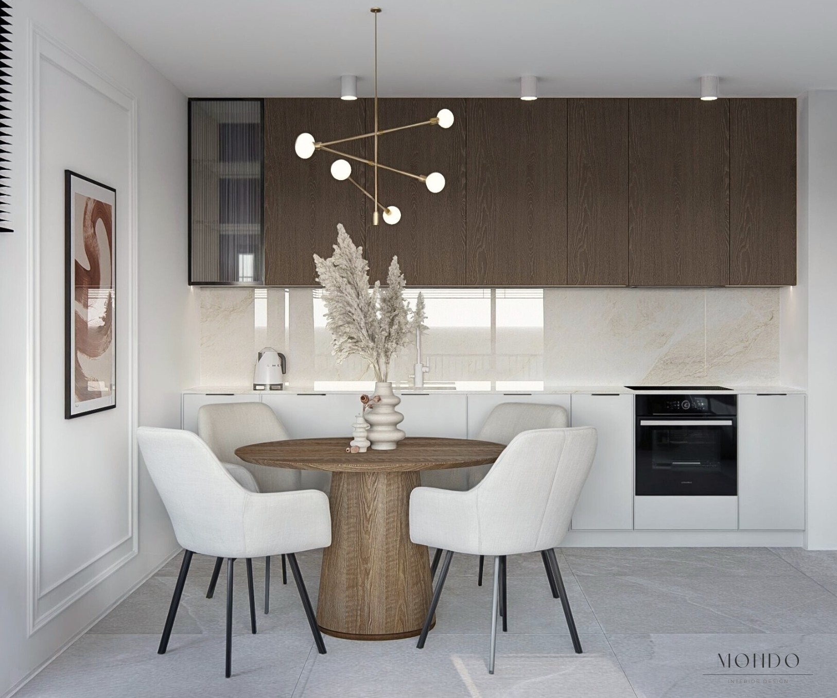 Wnętrze apartamentu w Międzywodziu to połączenie subtelnych beżów z akcentami głębokiego bordo oraz ciepłym, ciemnym drewnem.