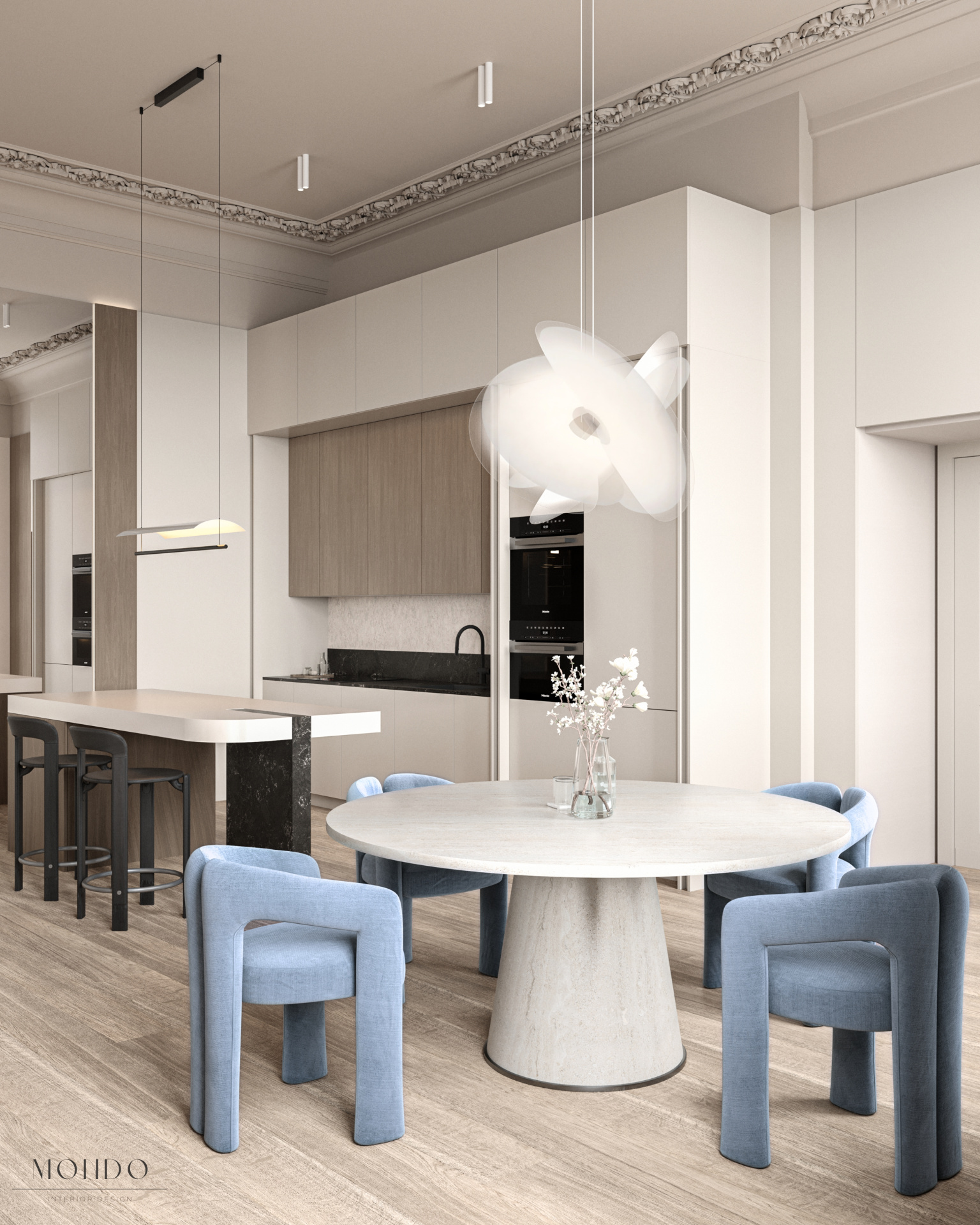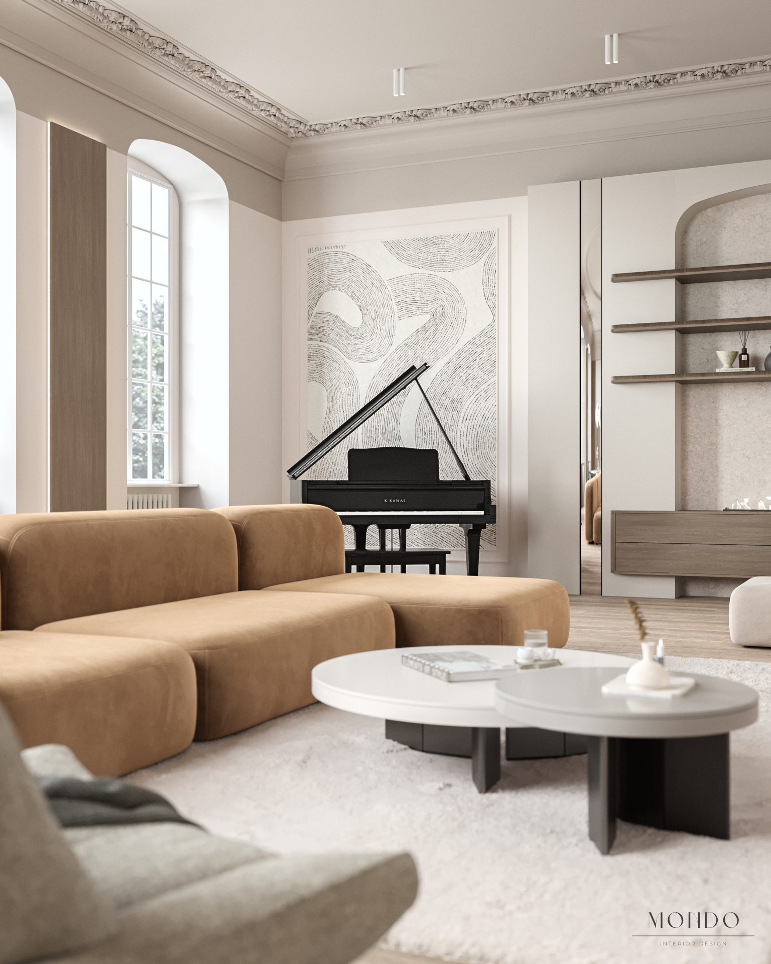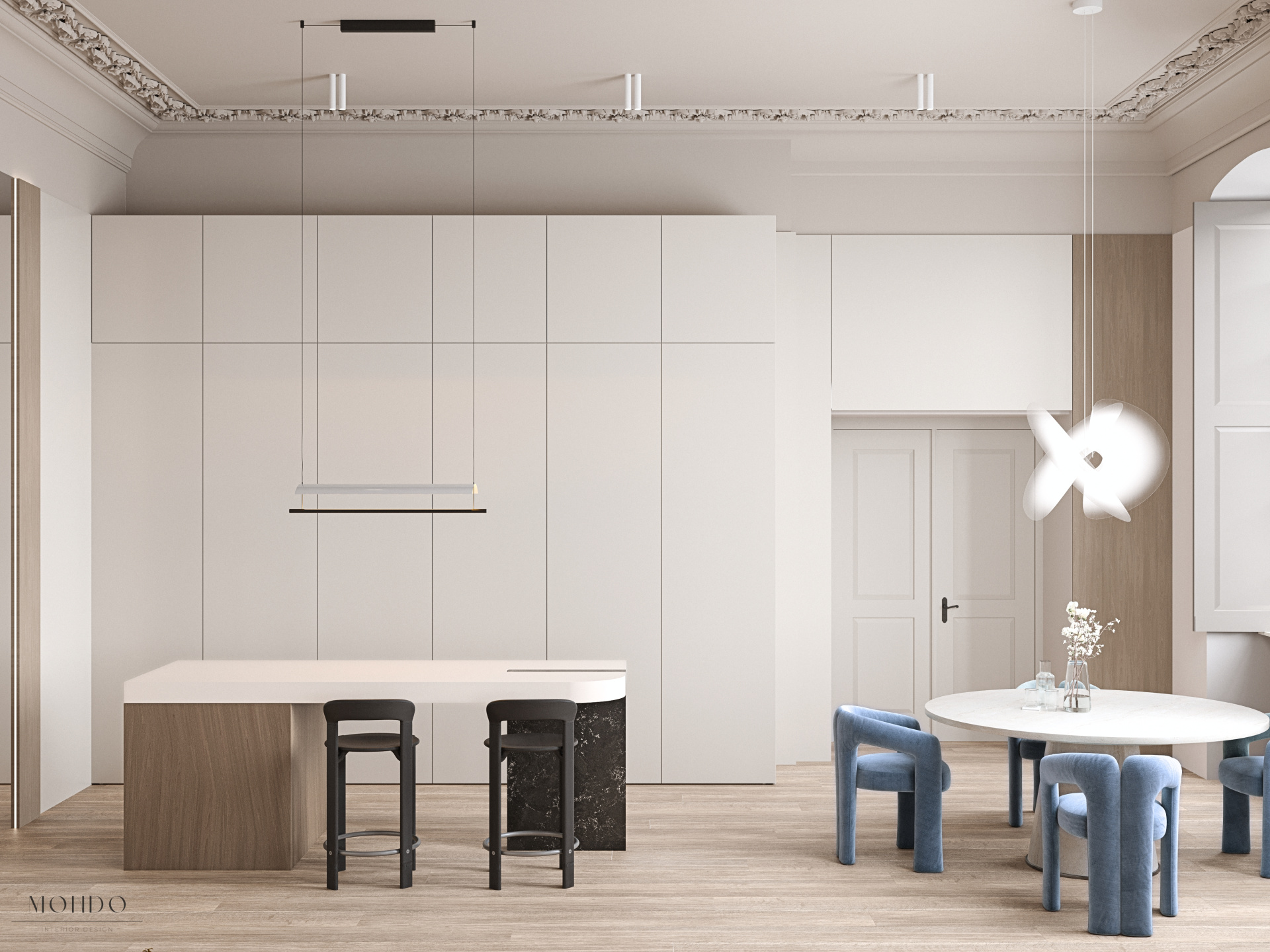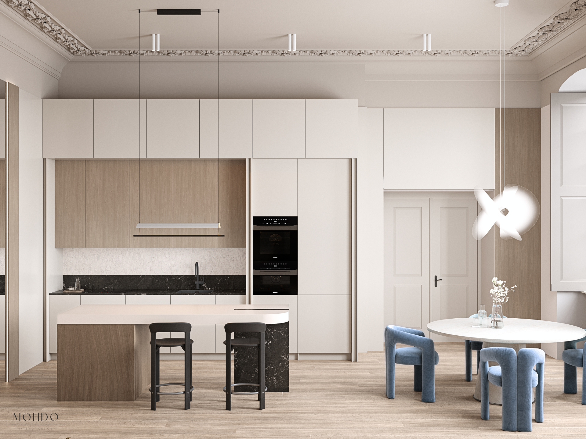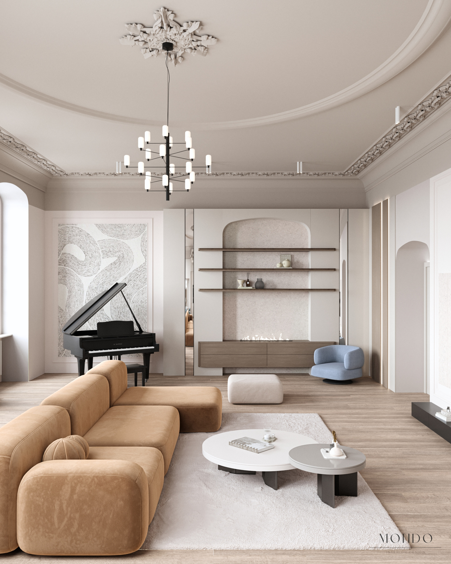 Projekt salonu z aneksem kuchennym, łączący nowoczesny charakter z klasycznymi detalami i zachowaną sztukaterią zabytkowego budynku. Przestrzeń została podzielona na kilka funkcjonalnych stref: część wypoczynkową z narożnikiem i fotelem, miejsce na fortepian oraz strefę jadalnianą połączoną z kuchnią. Aneks kuchenny zaprojektowano w praktyczny sposób – z możliwością jego zamknięcia i oddzielenia od strefy dziennej. Całość utrzymana w stonowanej palecie barw, z akcentami przygaszonej pomarańczy i błękitu.
