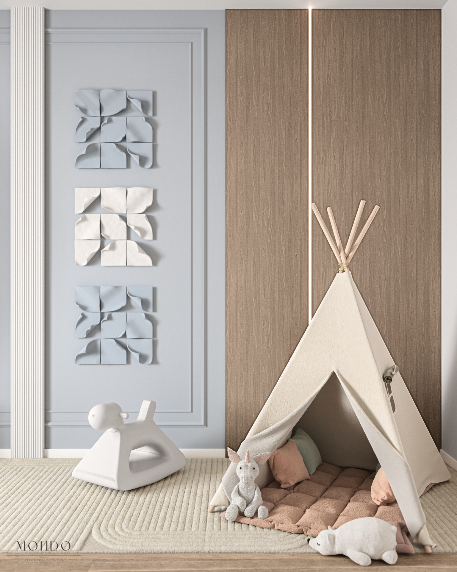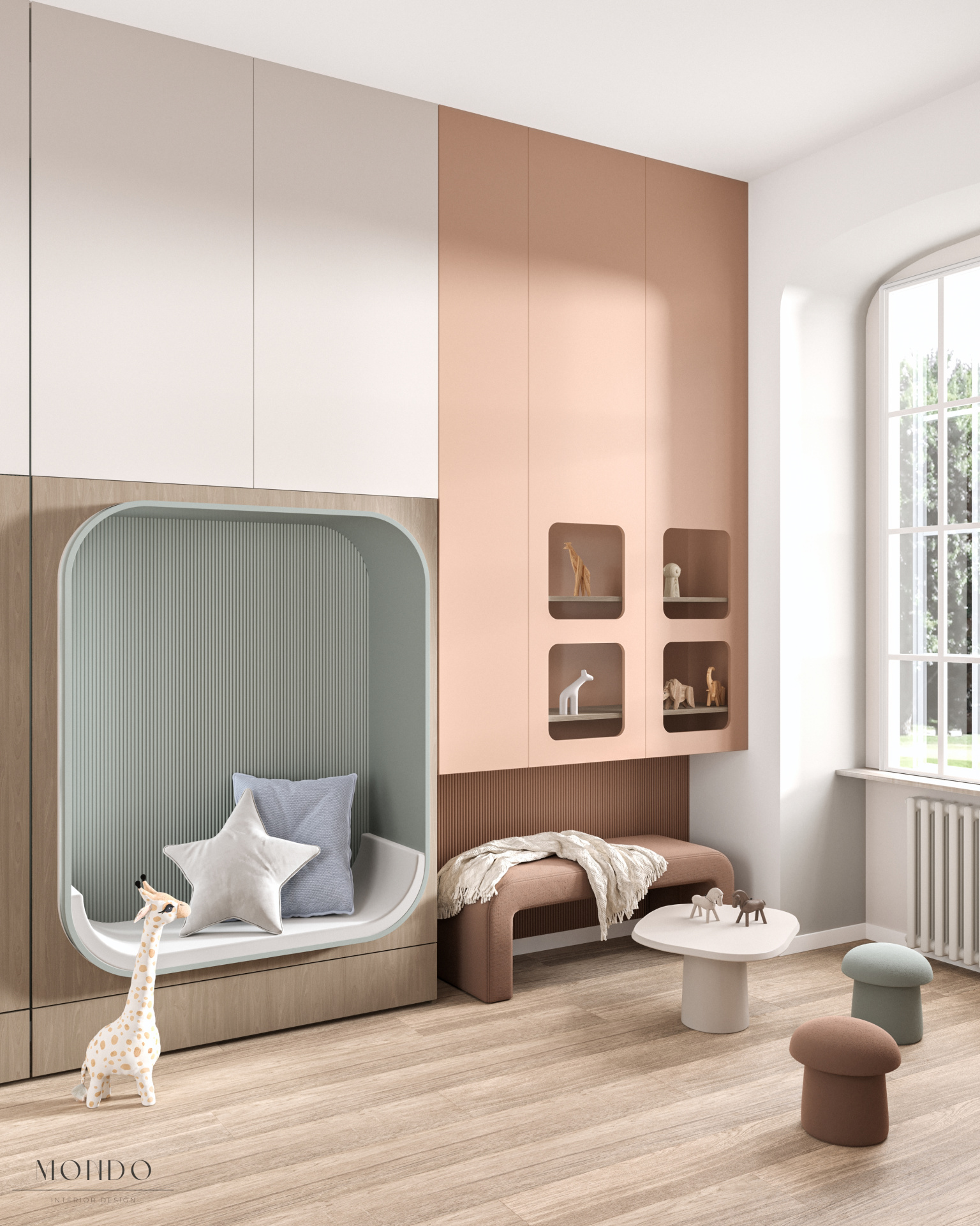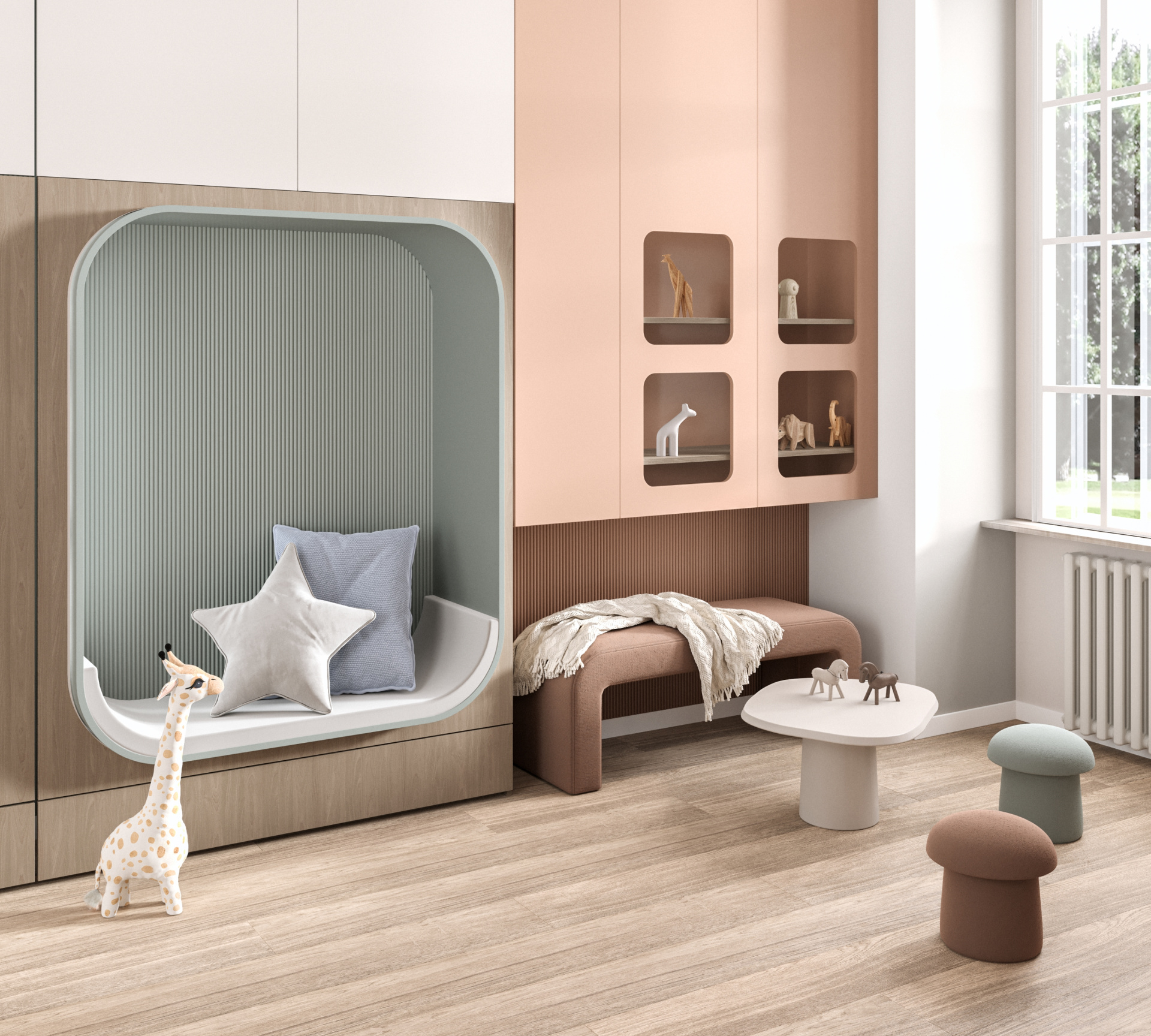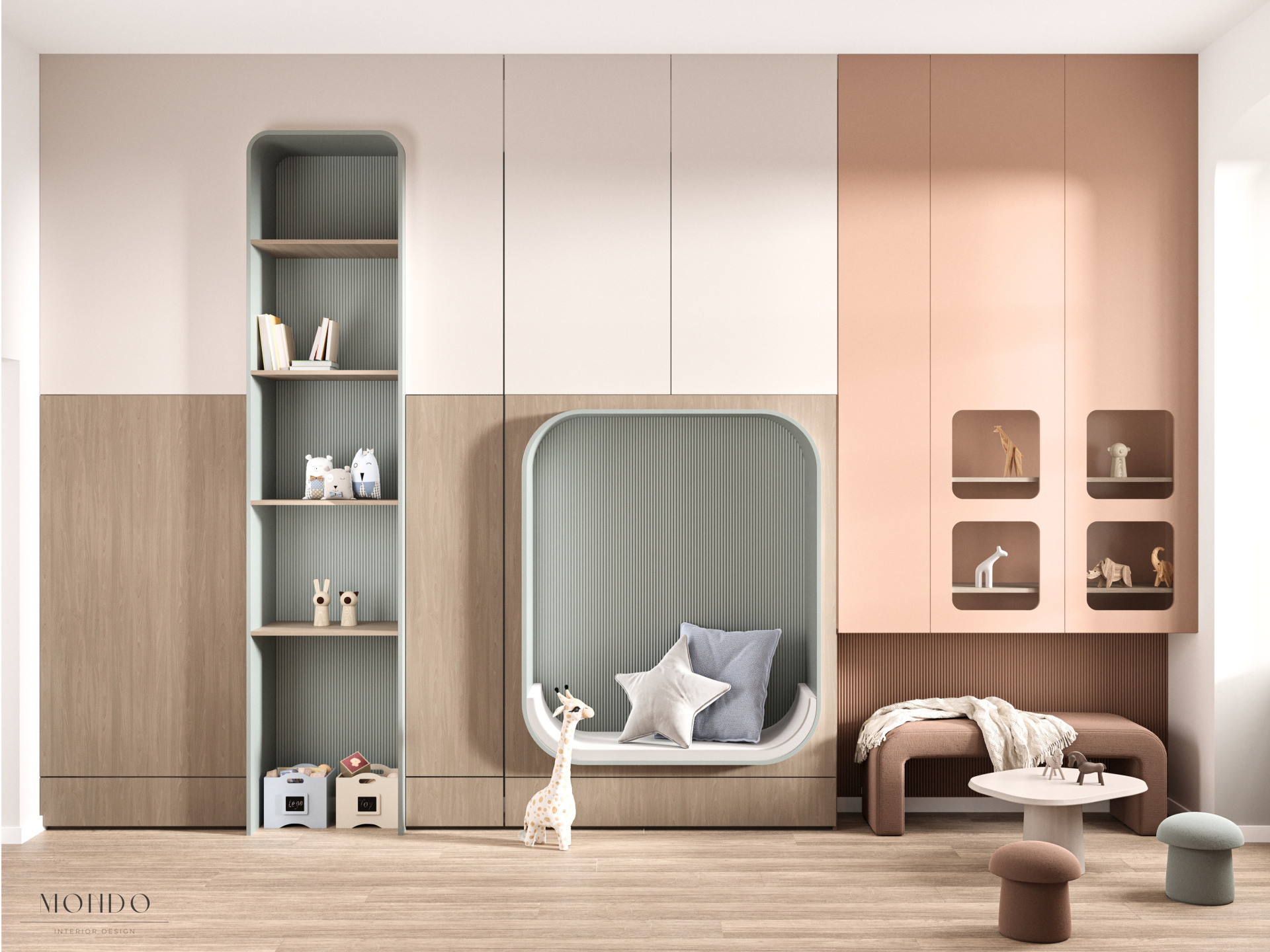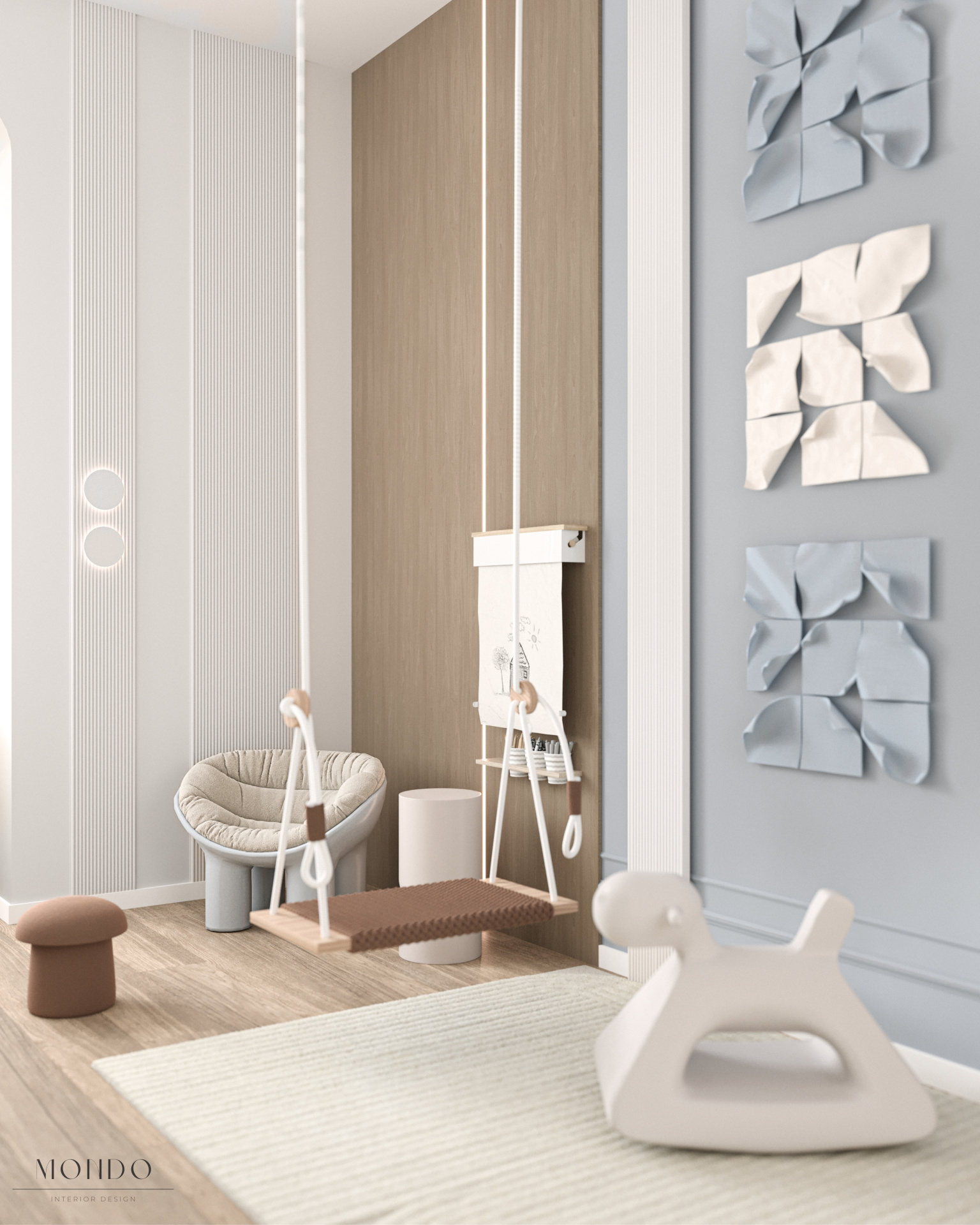 Przytulna, pastelowa przestrzeń zaprojektowana z myślą o komforcie i poczuciu bezpieczeństwa najmłodszych. Wnętrze wyposażono w zabudowę na zabawki oraz regały na figurki wykorzystywane w terapii. Dodatkowe elementy, takie jak huśtawka czy siedzisko w zabudowie, pozwalają dziecku poczuć się swobodnie i bezpiecznie podczas zajęć. To miejsce, w którym terapia staje się naturalną częścią zabawy i budowania relacji.